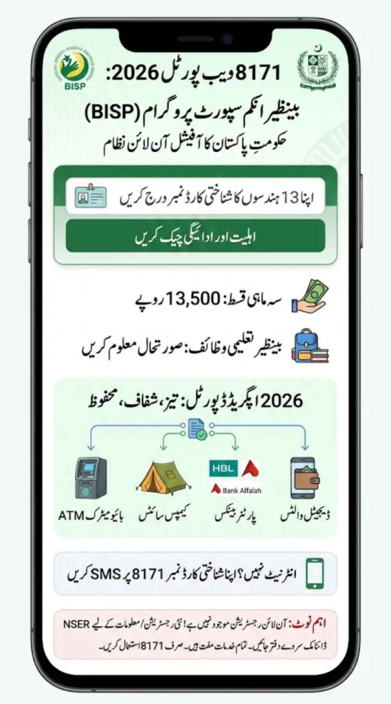 The 8171 Web Portal 2026 is an advanced digital platform designed to provide transparency and ease of access to the Benazir Income Support Programme beneficiaries. In 2026, the portal has been updated to handle massive traffic, ensuring that users experience zero downtime when checking their eligibility. The new system is directly linked with the National Socio-Economic Registry (NSER), allowing for immediate updates on poverty (PMT) scores. Whether you are a regular beneficiary of the Benazir Kafaalat program or a parent checking Taleemi Wazaif stipends for your children, the 8171 portal serves as the single official source for all your financial queries.