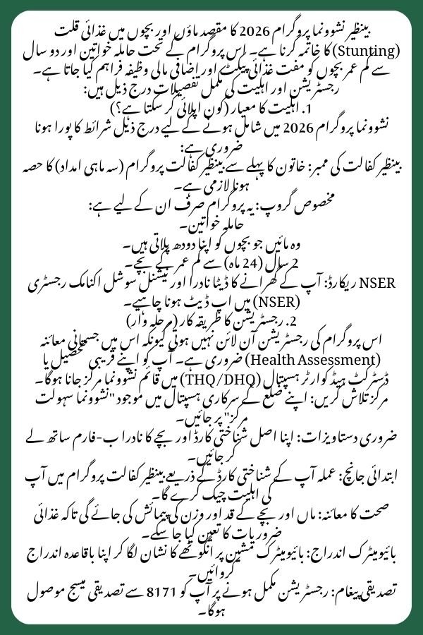 There is no online registration for this program because it requires a physical health assessment. You must visit a Nashonuma Facilitation Center, usually located within Tehsil Headquarter (THQ) or District Headquarter (DHQ) hospitals.