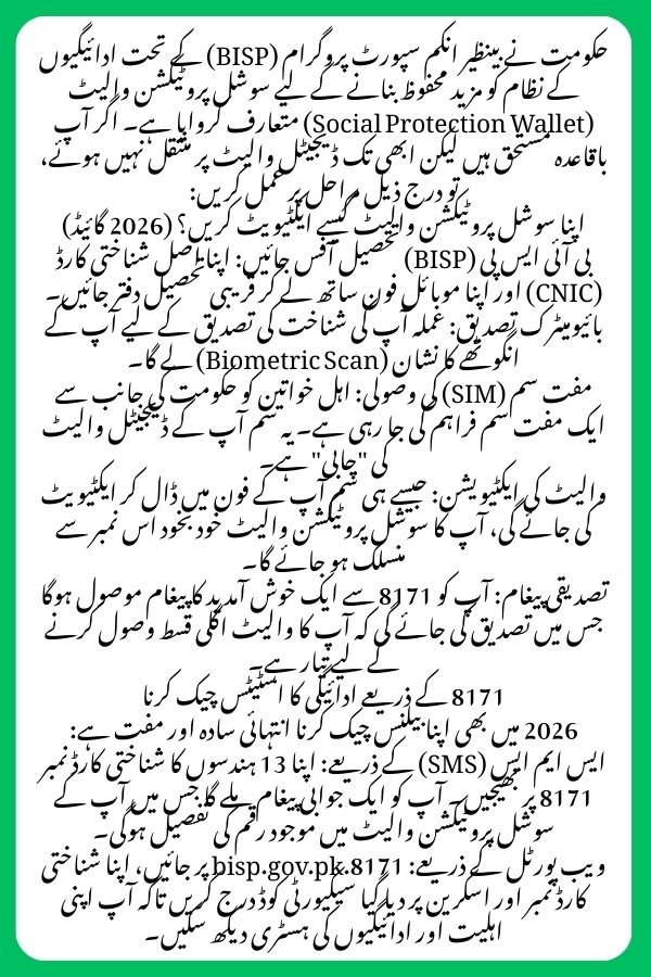 The Social Protection Wallet is a digital account linked to the beneficiary’s CNIC and a dedicated mobile SIM card. In 2026, the program has shifted from “camp-site payments” to “Wallet-based payments.” ### Key Benefits in 2026: