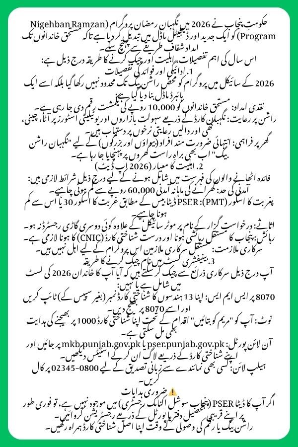 The CM Punjab Nigehban Card 2026 is the primary vehicle for delivering the Rs. 10,000 Ramzan Relief to approximately 4.2 million families in Punjab. As of February 27, 2026, the distribution of these digital smart cards has officially started across various districts.