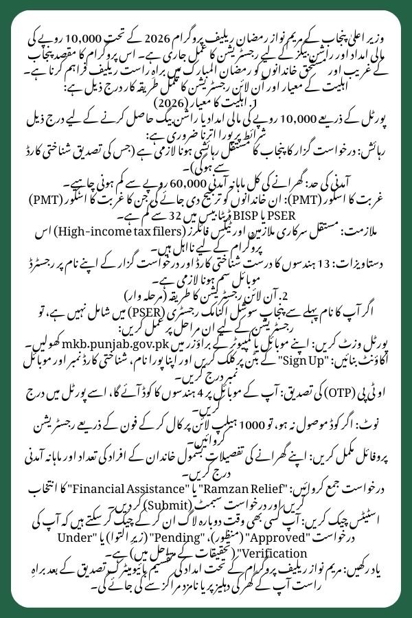The Maryam Ko Batayn (1000) web portal and mobile application are the official digital platforms launched by Chief Minister Maryam Nawaz to provide direct relief and grievance redressal for the residents of Punjab. For the 2026 Ramadan cycle, this system is being used to distribute Rs. 10,000 cash assistance and monitor the “Nigehban” ration delivery.