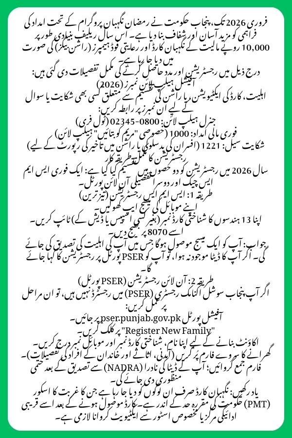 The Punjab Government has streamlined its support system under the Ramzan Nigehban Program. This year, the relief is primarily delivered through the Nigehban Card (worth Rs. 10,000) and subsidized food hampers.